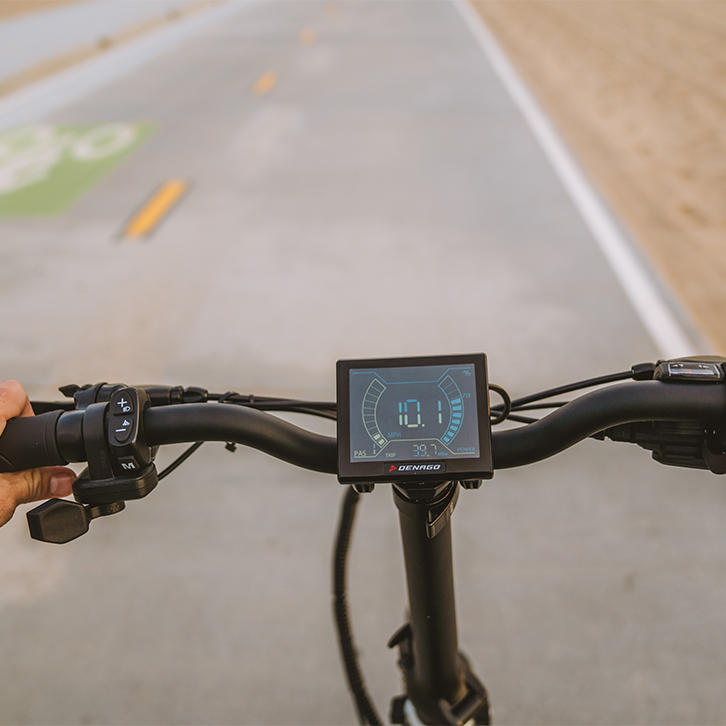 Denago高区分率LCD,,,,,,,具有速率,,,,,,,行程距离,,,,,,,里程表,,,,,,,行程时间,,,,,,,电池充电水平和步行模式功效;加上集成的前后灯控制。。。。。。。